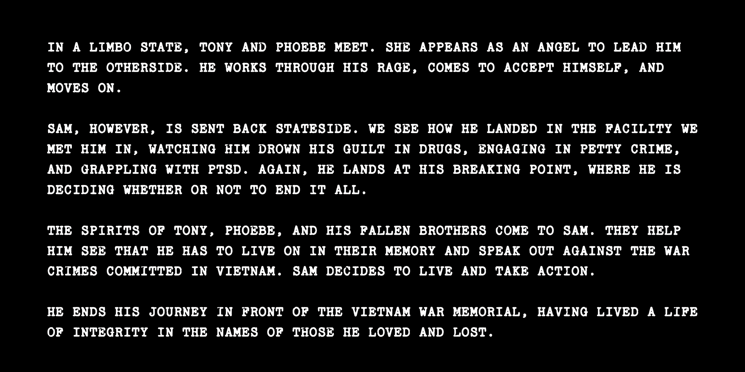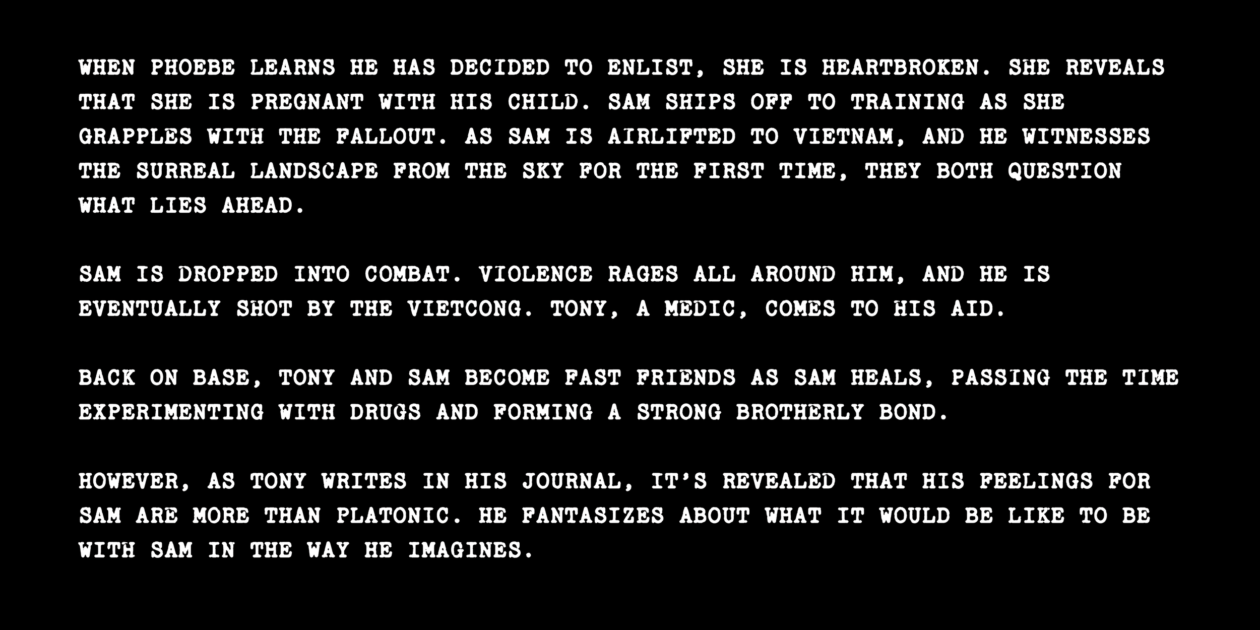 In 1967, Sam is unwillingly drafted to the corrupt jungles of Vietnam, where he undergoes an experience that turns his sense of self and understanding of the world upside down. Leaving his pregnant fiancé, Pheobe, stateside, he navigated an alien world with inverted rules and discovers a love for a fellow soldier, Tony, that is more than platonic. As a war rages on within and around him, Sam grapples with a shifting sense of morality and what it means to be a hero.