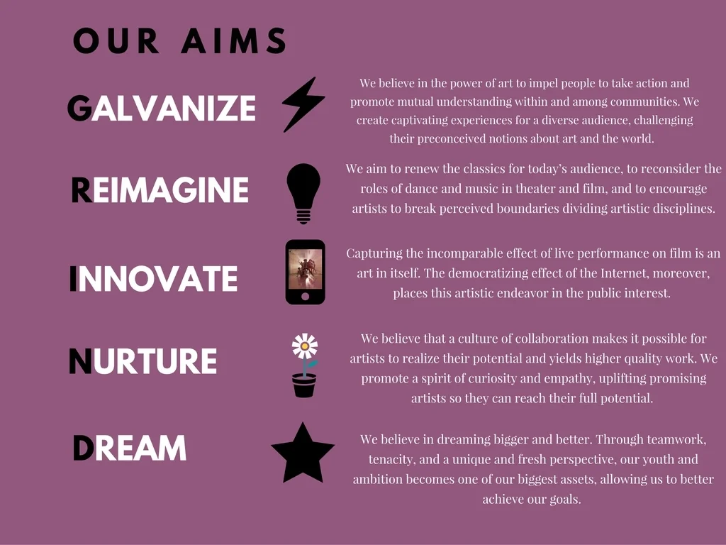 The stories we put on stage form the collective consciousness of our society. We at Grind Arts Co. are devoted to honoring great works of theater and dance, old and new, and disseminating them to a world of people glued to their phones. We must acknowledge that the parameters of the theater itself have changed. We embrace the new platforms that consume modern audiences to bring theater to them, and, in turn, bring them to the theater.
