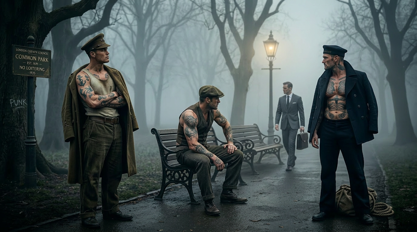 Daddy, a mafia-affiliated pimp, and his rough trade huslters: The Soldier, The Piers Worker, The Sailor, and the College Boy